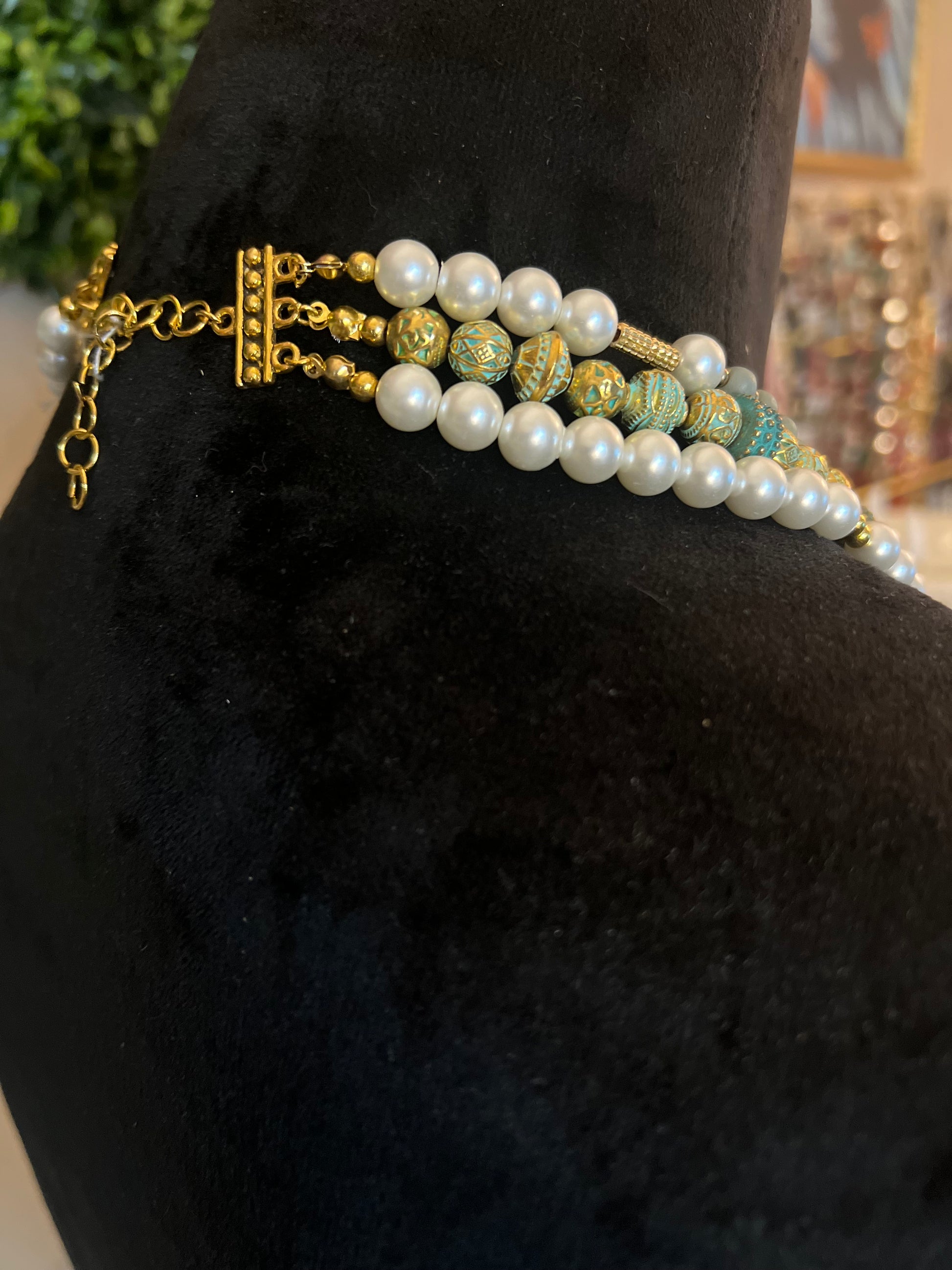 Unlock timeless beauty with this opulent multi-strand necklace and matching bracelet set. Designed with a regal blend of soft sage green, creamy pearl, and ornate antique gold accents, this jewelry set embodies sophistication with a vintage soul.