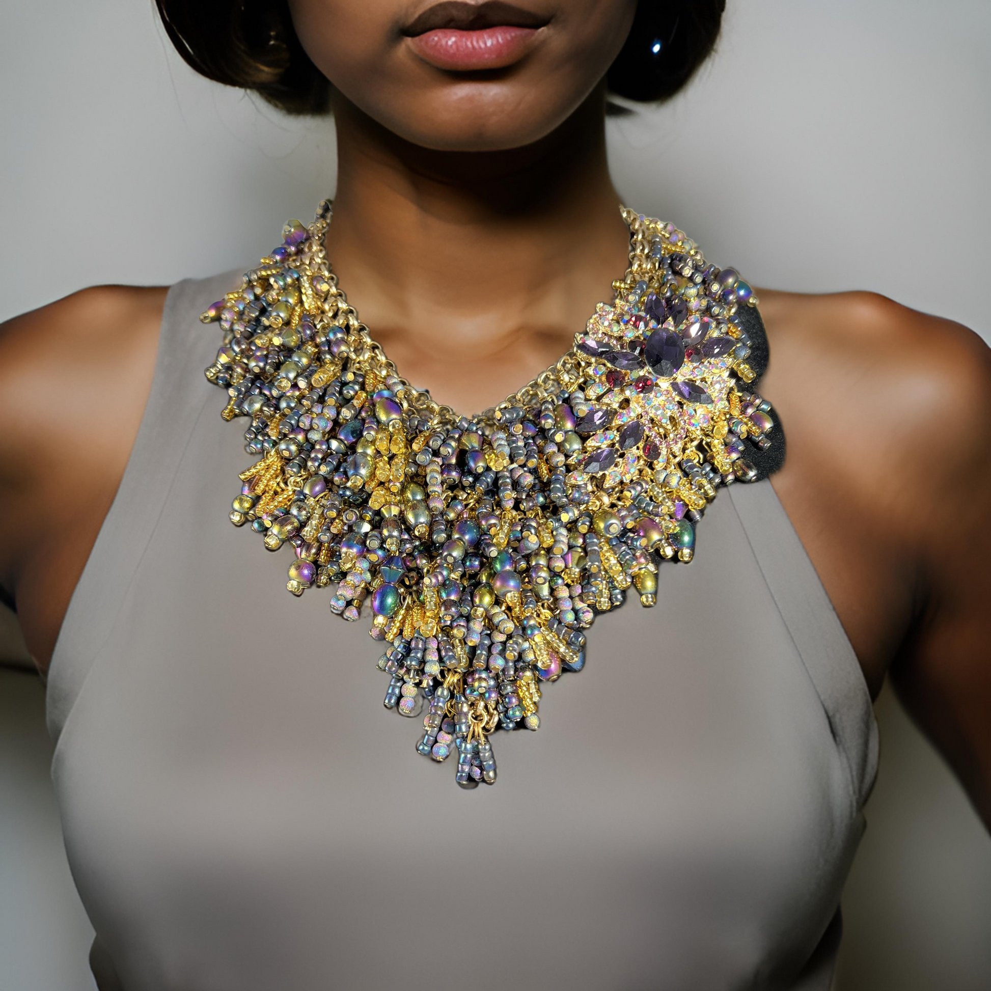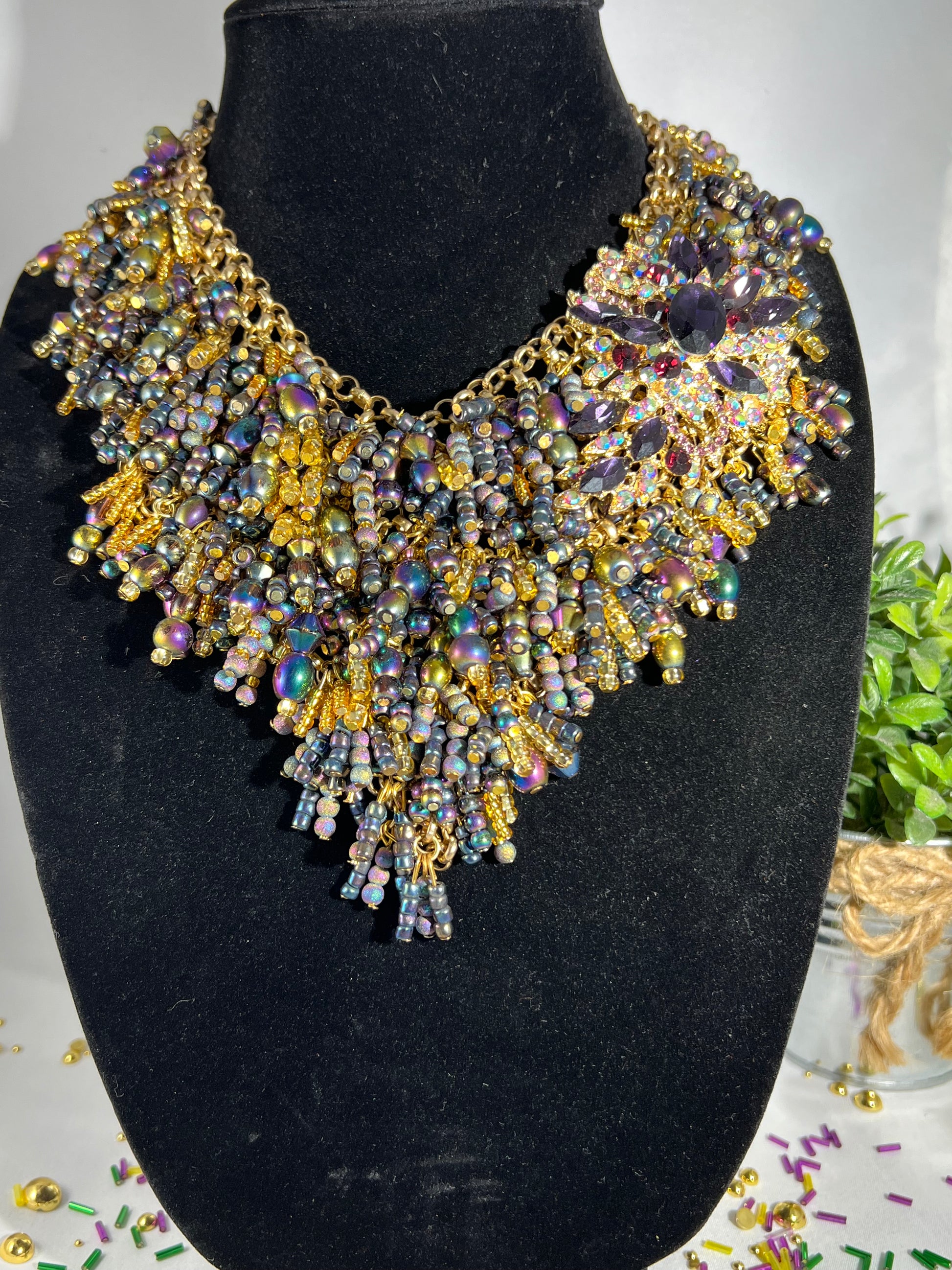 Step into the spotlight with this show-stopping beaded fringe necklace. Overflowing with iridescent seed beads and metallic gold accents, this piece dazzles with dynamic movement and rich color. A dramatic floral burst made of faceted purple and rainbow crystals adds a glamorous focal point to the neckline, giving it a couture, red-carpet-ready feel.