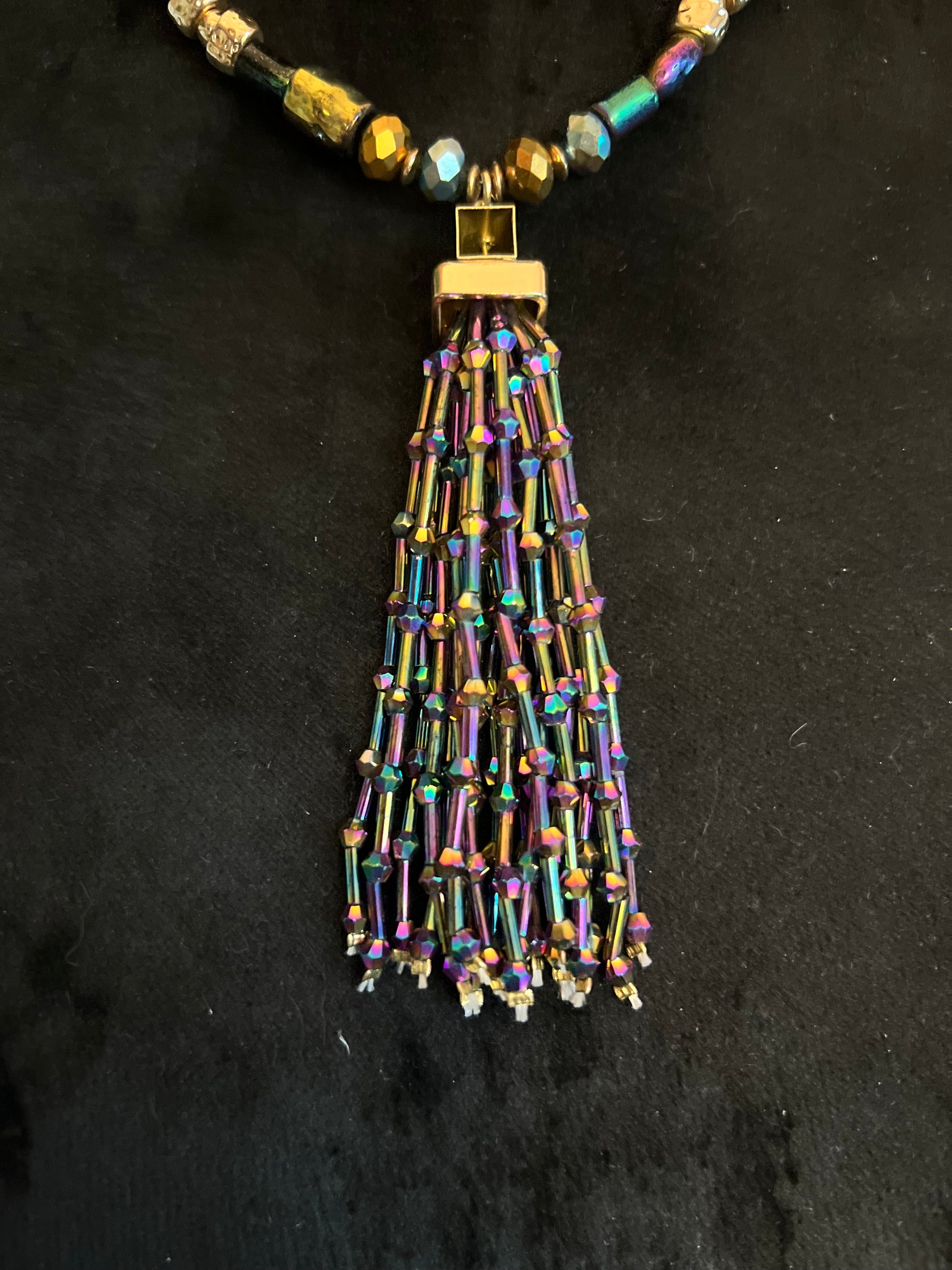 Long iridescent tassel pendant: adds dramatic vertical flow and shimmering texture — perfect for elongating the silhouette and catching light.