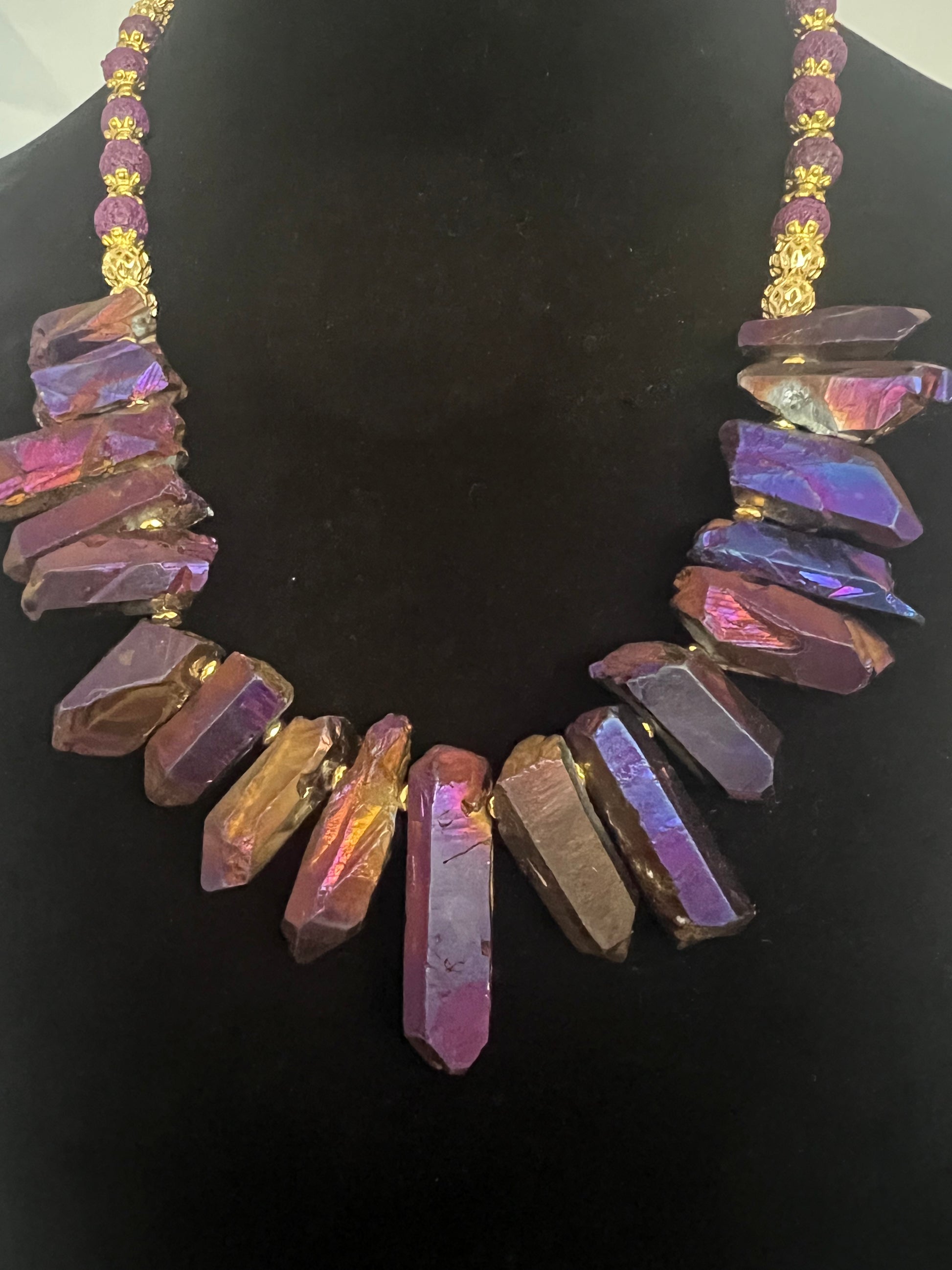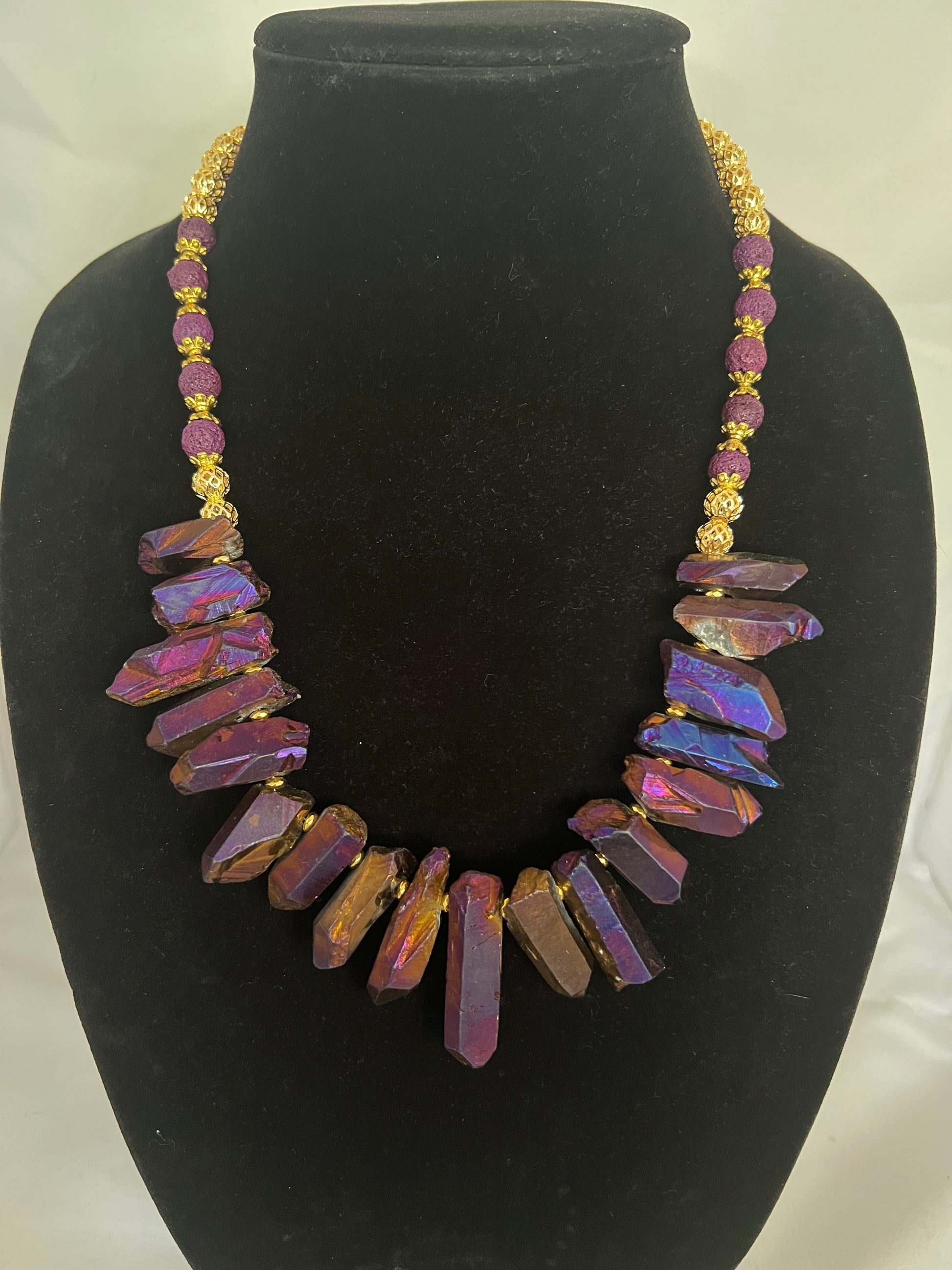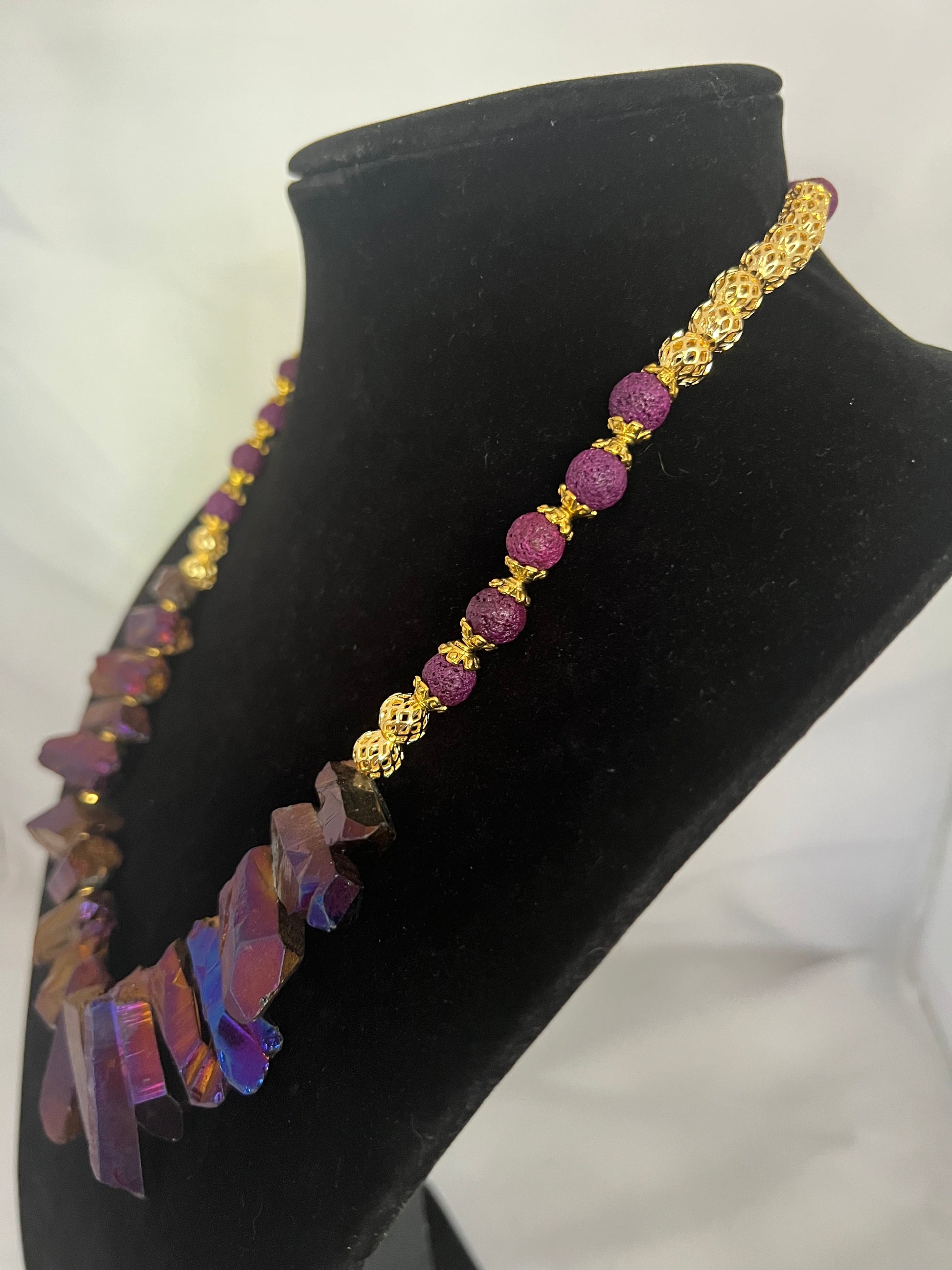 Iridescent Aura Quartz Statement Necklace – Crystal Healing with Purple Lava Beads & Gold Accents