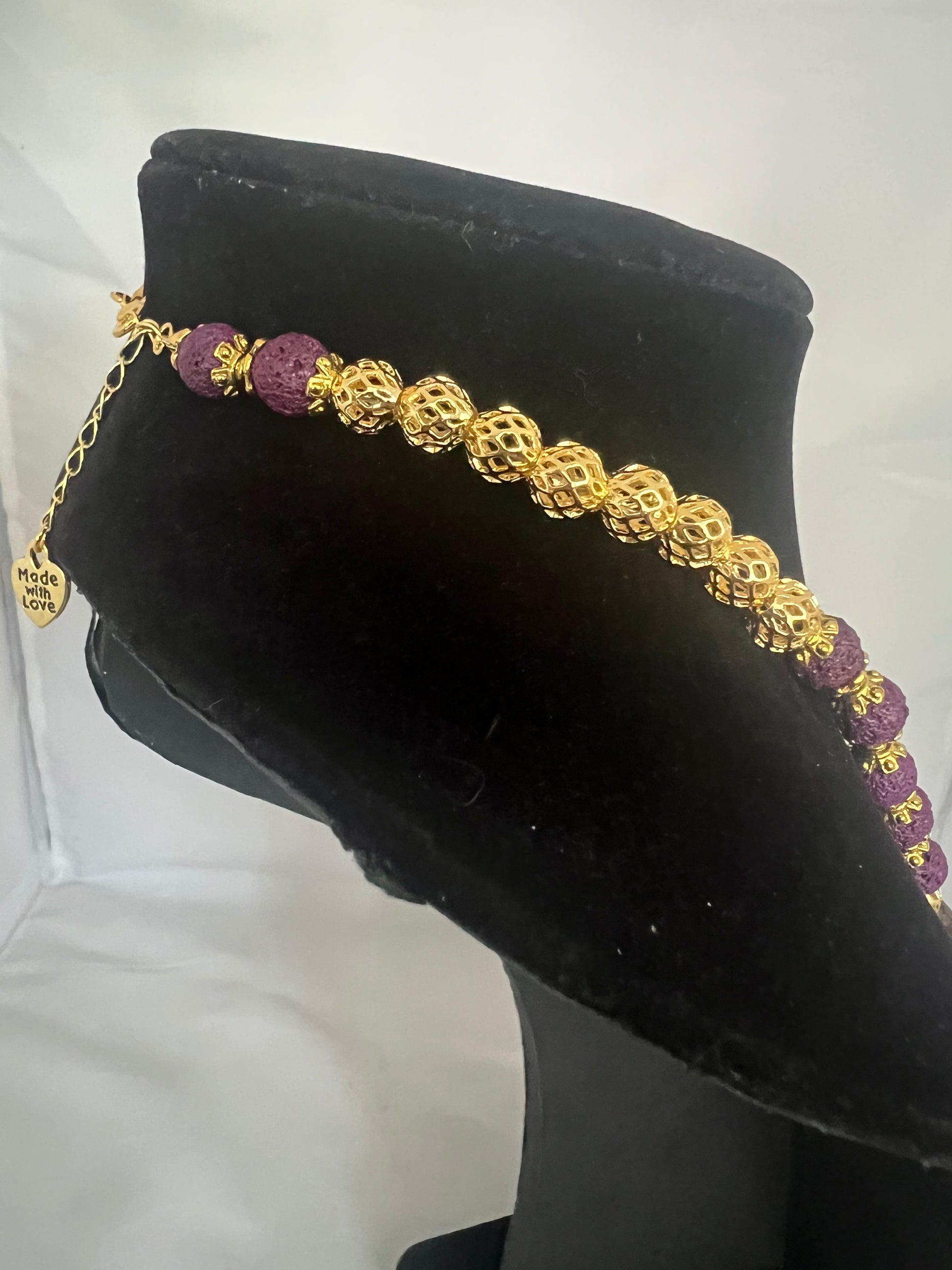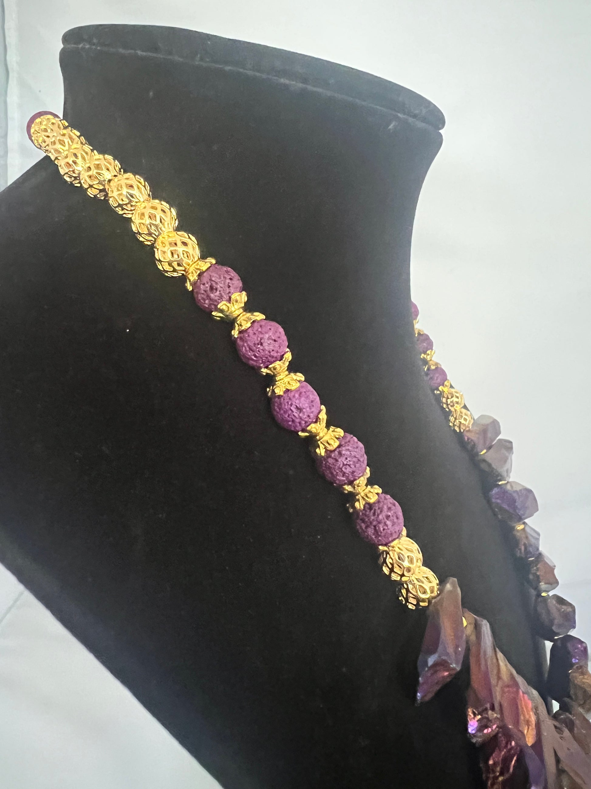 Tap into your inner energy with this radiant aura quartz necklace—designed to balance beauty with intention. Featuring raw-cut aura quartz crystal points in shimmering purple with flashes of gold and blue, this necklace promotes clarity, spiritual alignment, and positive energy. The rich purple lava beads are believed to provide grounding and emotional balance, while gold-tone filigree spacers add a regal finishing touch.