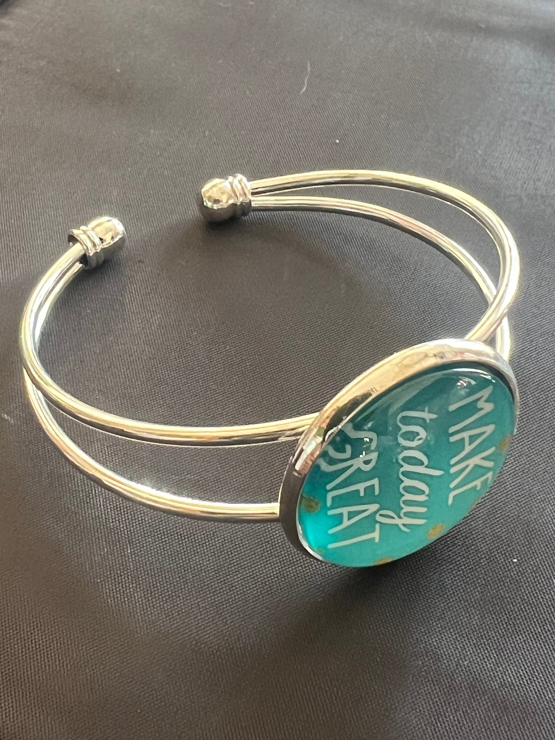 Brighten your mood and your outfit with the Greatness Begins Cuff. Featuring a striking teal background and the uplifting phrase “Make Today Great,” this silver-toned cuff bracelet is your go-to source of daily motivation. Whether you're heading to work, class, or a weekend adventure, it adds both style and purpose to your day.