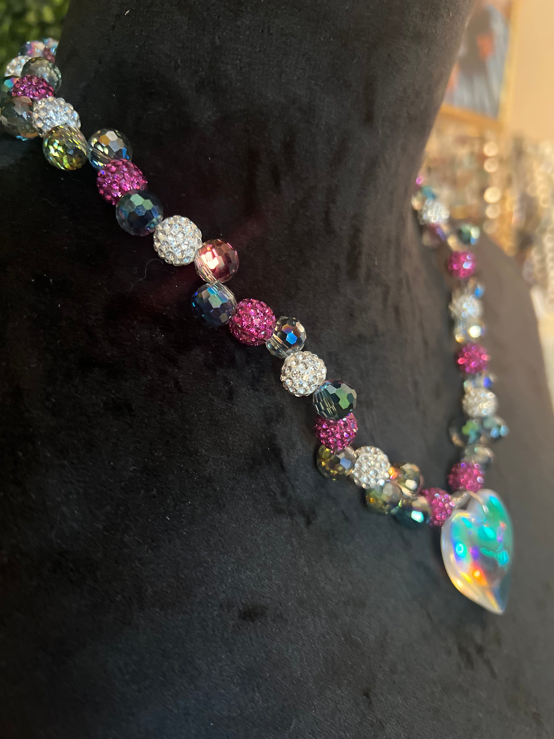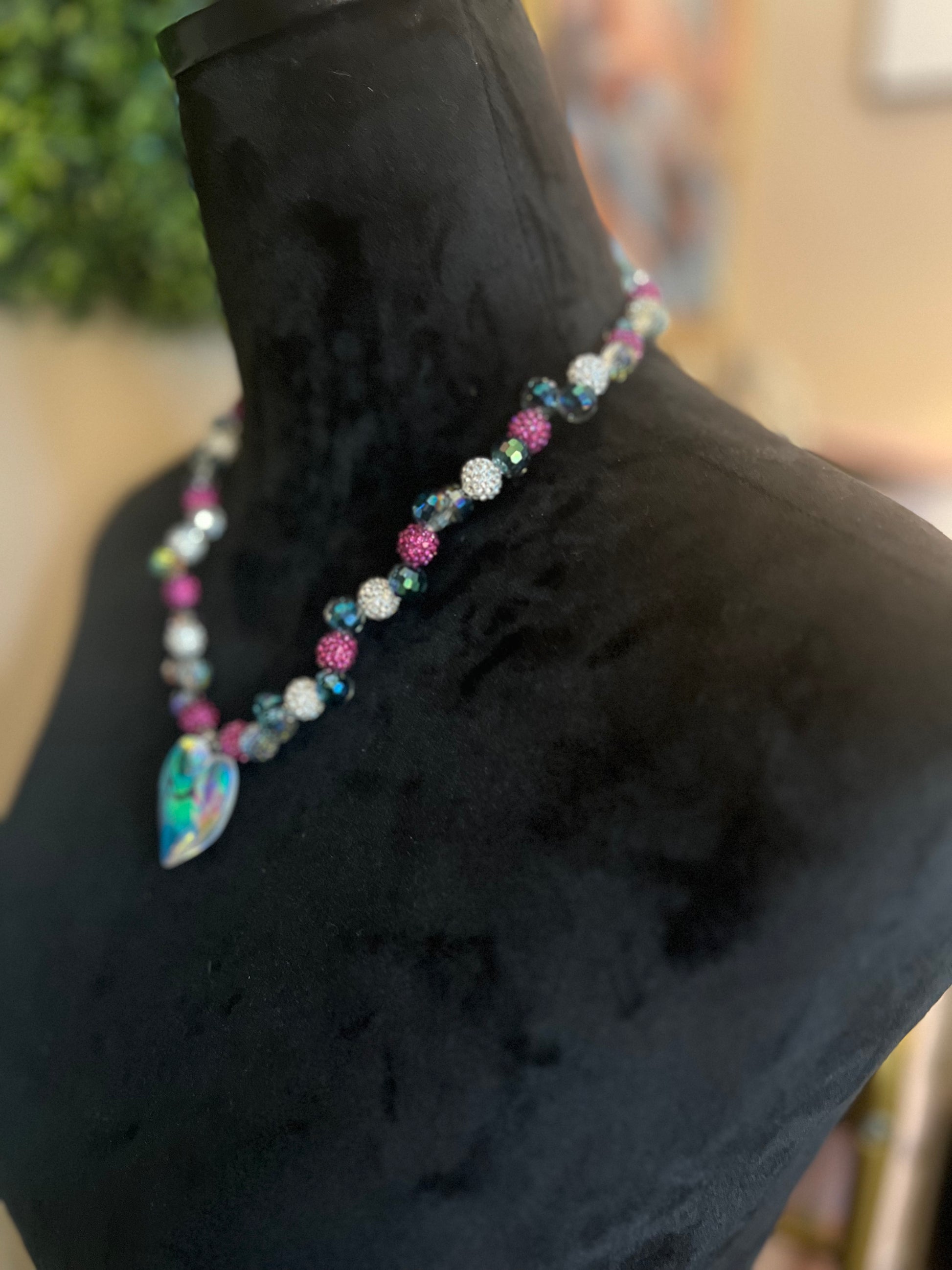 Fall in love at first sparkle with the Aurora Heart Necklace — a radiant celebration of color and romance. This dazzling statement piece features a mesmerizing iridescent heart pendant that captures the light and reflects a spectrum of hues with every movement. Encircling your neckline are shimmering faceted beads in jewel tones of fuchsia, crystal white, and deep teal, each alternating with glittering rhinestone spheres for maximum brilliance.