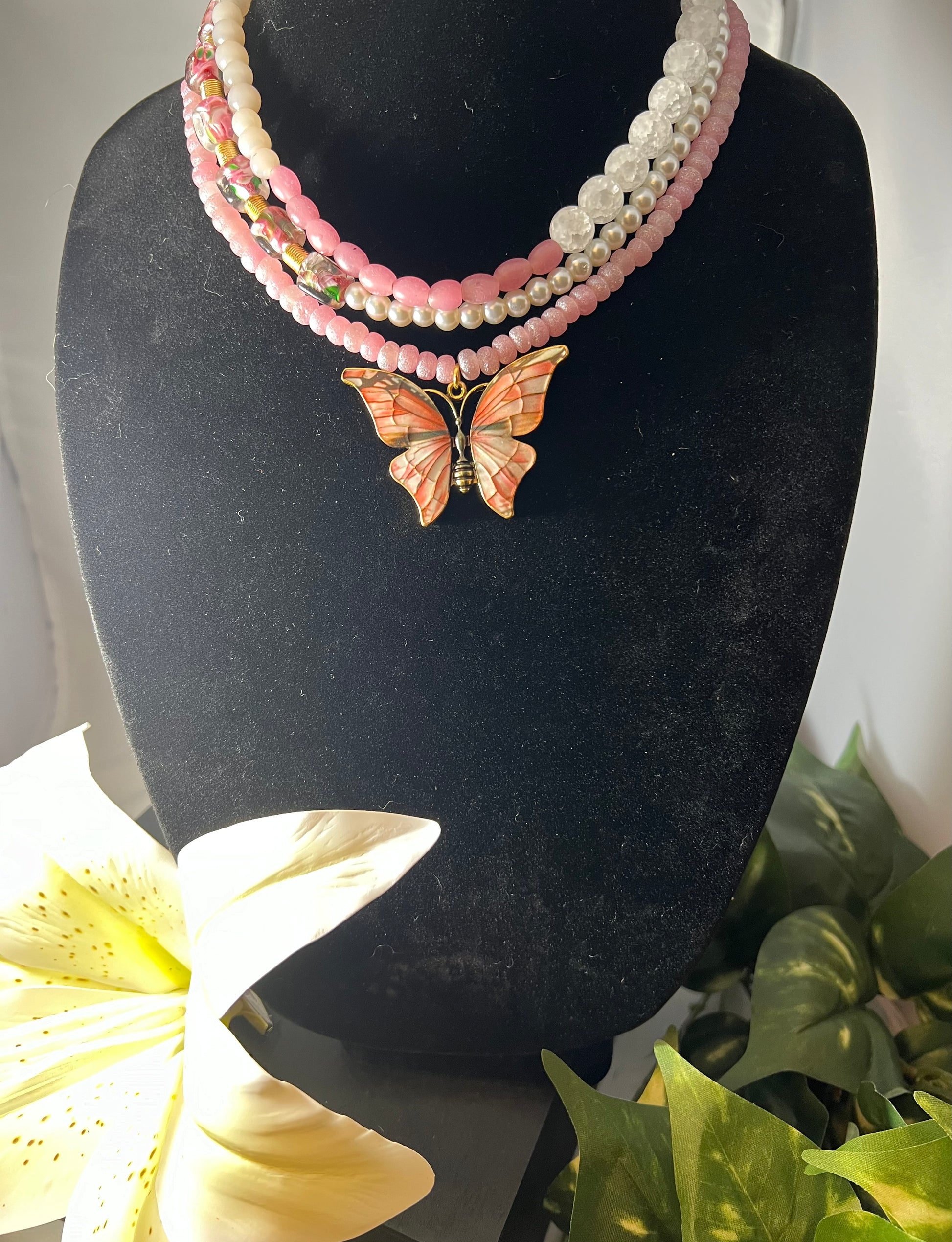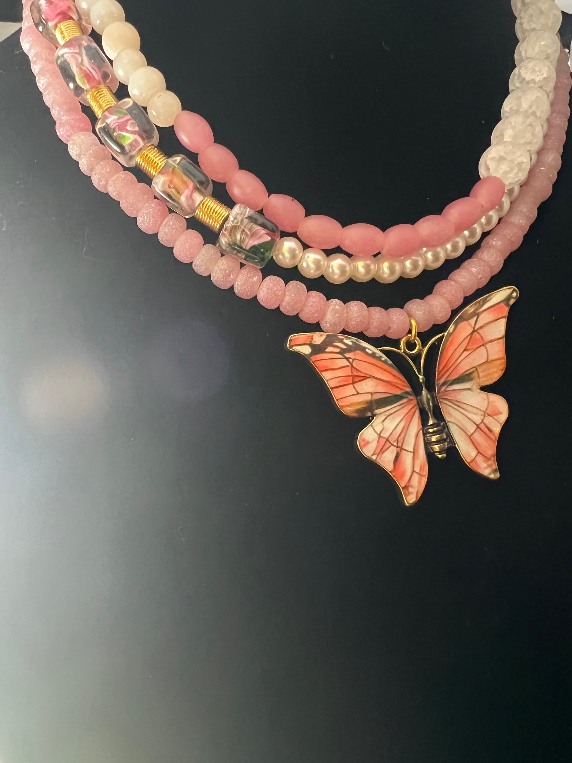 Multistrand Pink Beaded Necklace with Enamel Butterfly Pendant – Whimsical & Feminine Statement