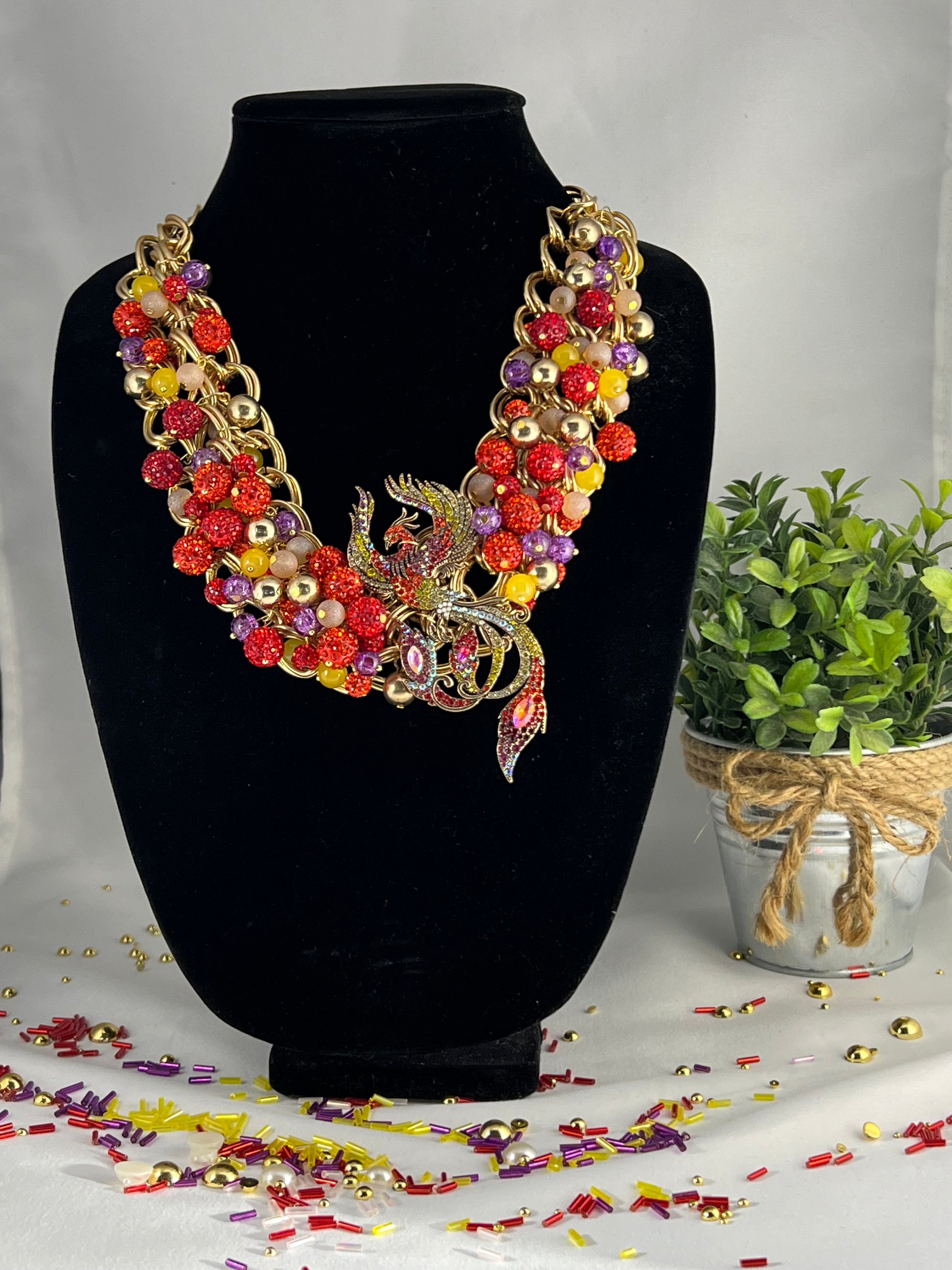 Unleash your inner fire with this bold and captivating Phoenix Statement Necklace. Layered with textured beads in vibrant reds, purples, yellows, and gold, this piece bursts with color and life. The dazzling centerpiece—a majestic phoenix encrusted with multicolor crystals—symbolizes rebirth, strength, and transformation, making it perfect for those who love fearless fashion and storytelling through jewelry.