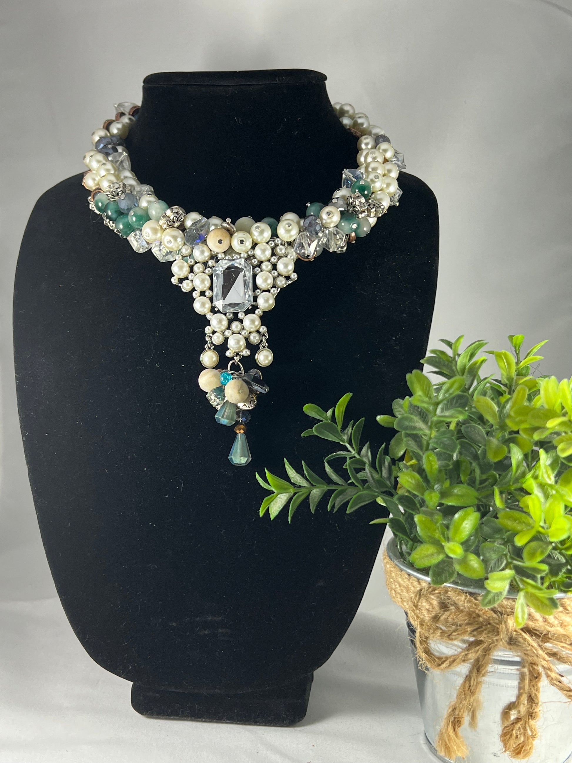 Turn heads with timeless elegance in this pearl and crystal cluster choker. Featuring layers of creamy faux pearls, translucent emerald-toned beads, and faceted crystals, this statement piece is centered around a dramatic rectangular crystal framed in pearls. The drop pendant is finished with a teardrop bead and earthy stone accents, blending vintage glam with a touch of natural texture.