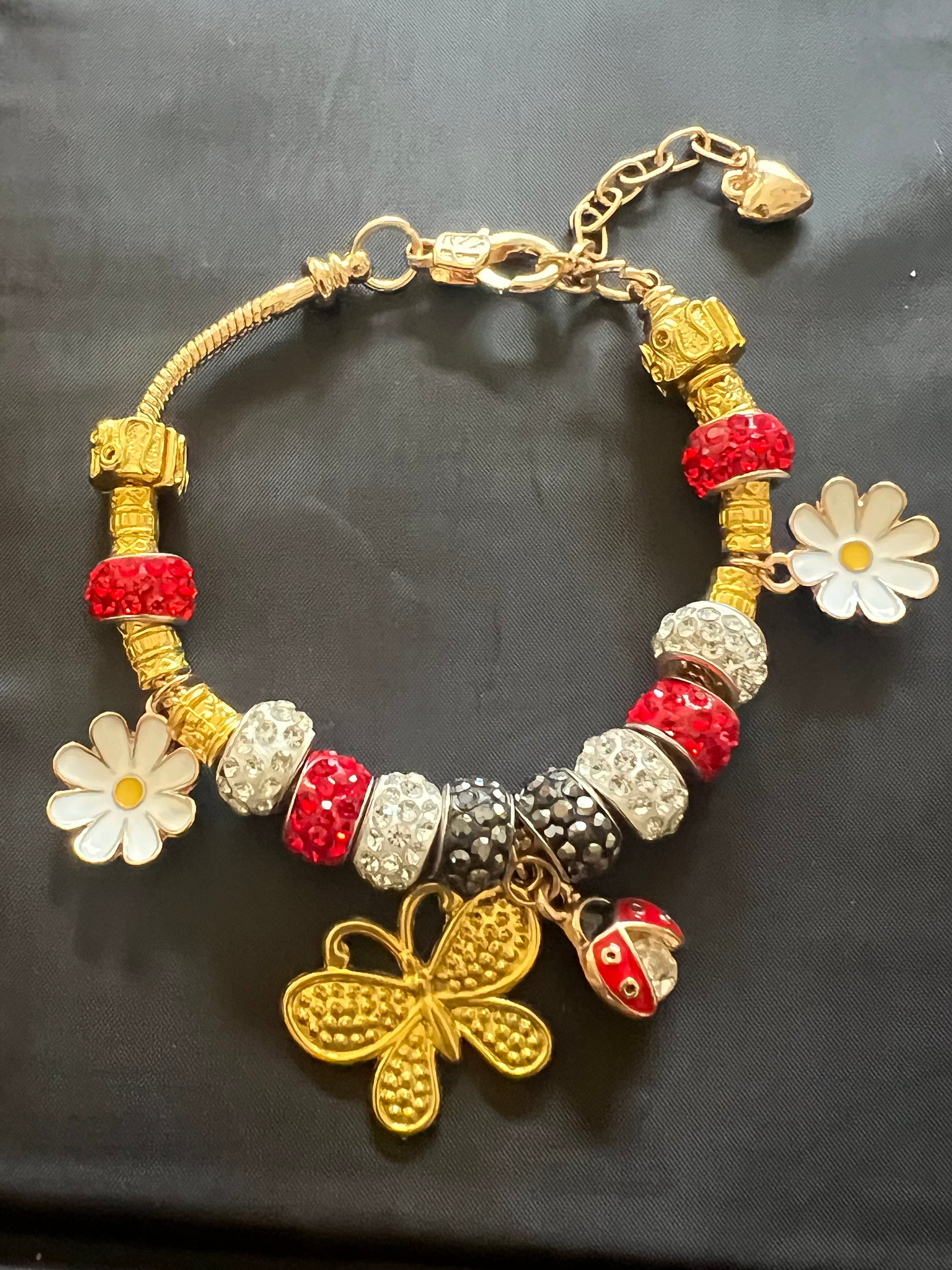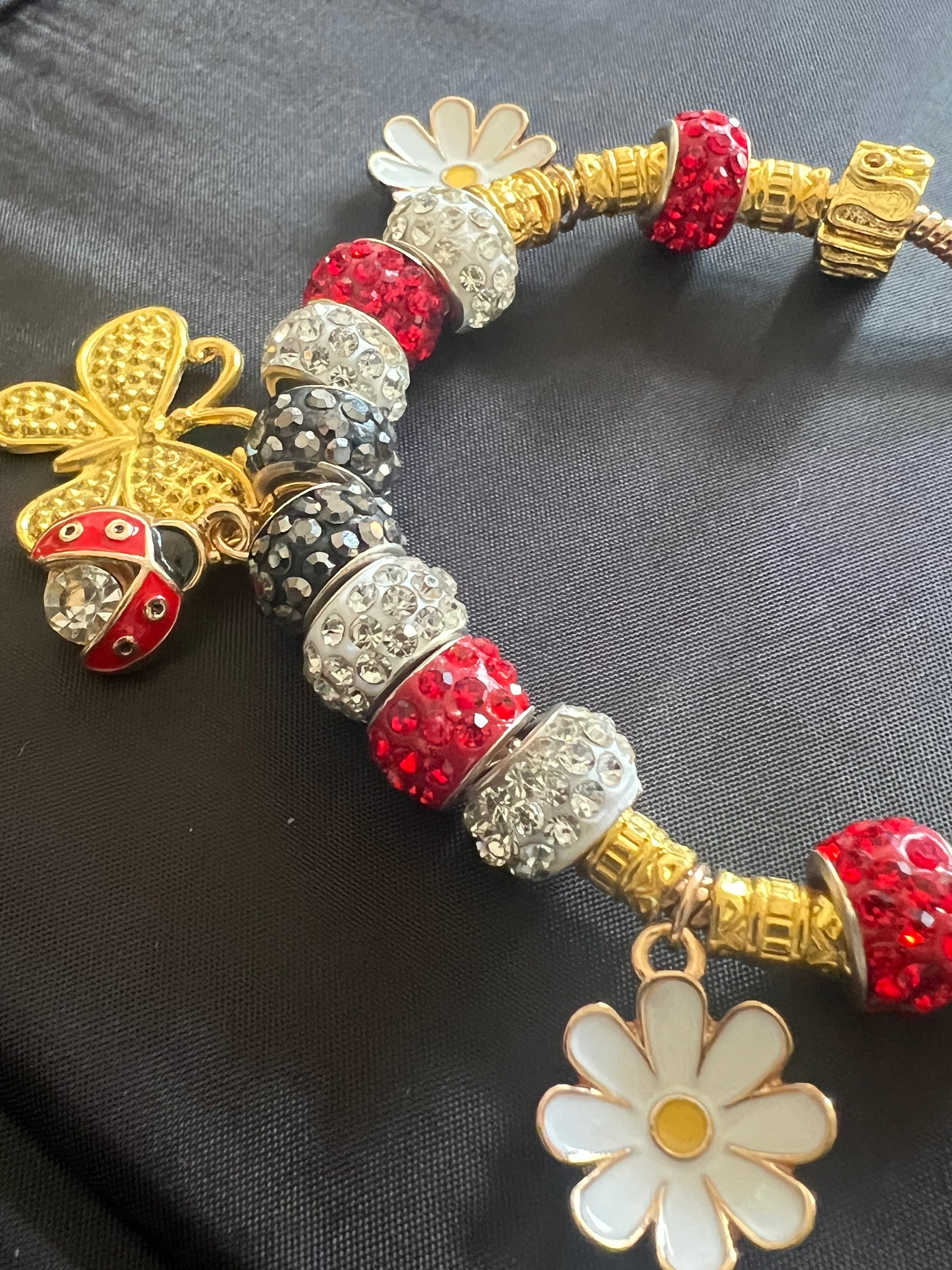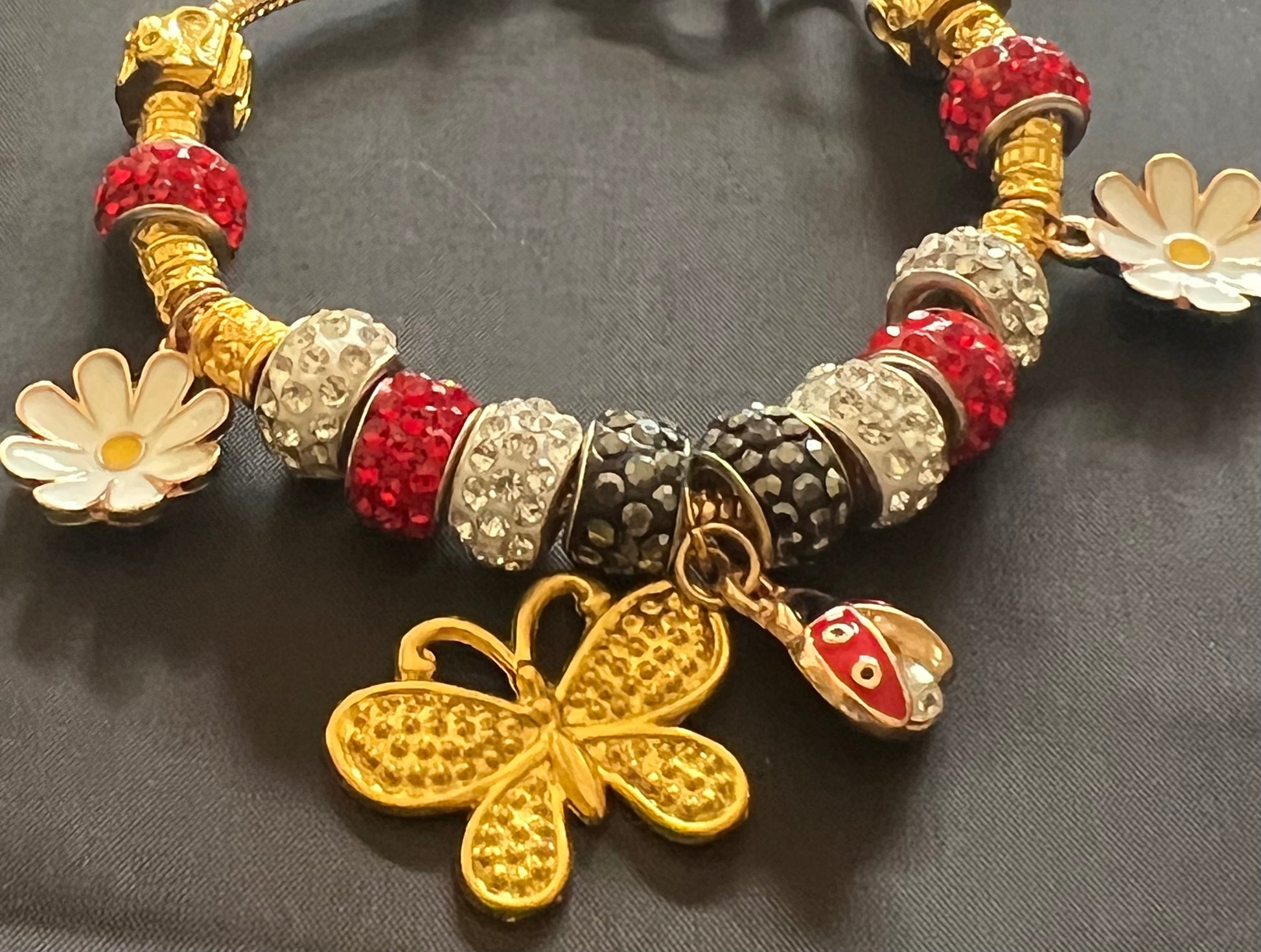 Celebrate the joy and vibrancy of nature with the Garden Whimsy Charm Bracelet. This delightful piece features a dazzling combination of red, white, black, and gold crystal-studded beads, beautifully accented with whimsical enamel charms — including cheerful daisies, a playful ladybug, and an intricately detailed golden butterfly. The bracelet brings a playful yet elegant feel to any outfit, perfect for those who adore charm jewelry with character.