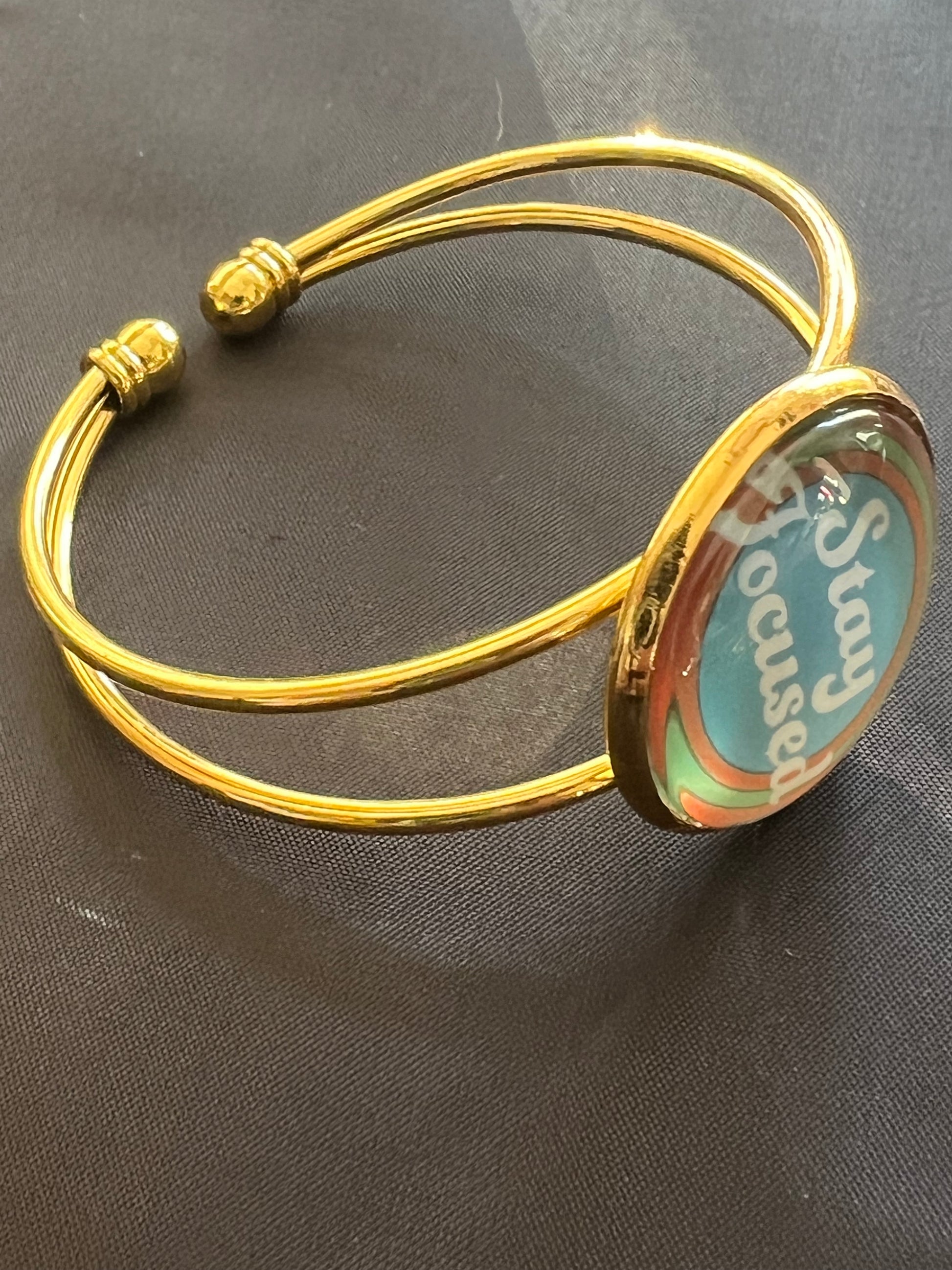 The Mind Over Matter Cuff is a sleek and empowering accessory designed to keep your goals in sight and distractions out of mind. Featuring a bold “Stay Focused” message encased in a glossy dome, this bracelet is both a motivational mantra and a stylish statement. With its polished gold-tone structure and adjustable open cuff, it’s perfect for driven individuals who love meaningful fashion.