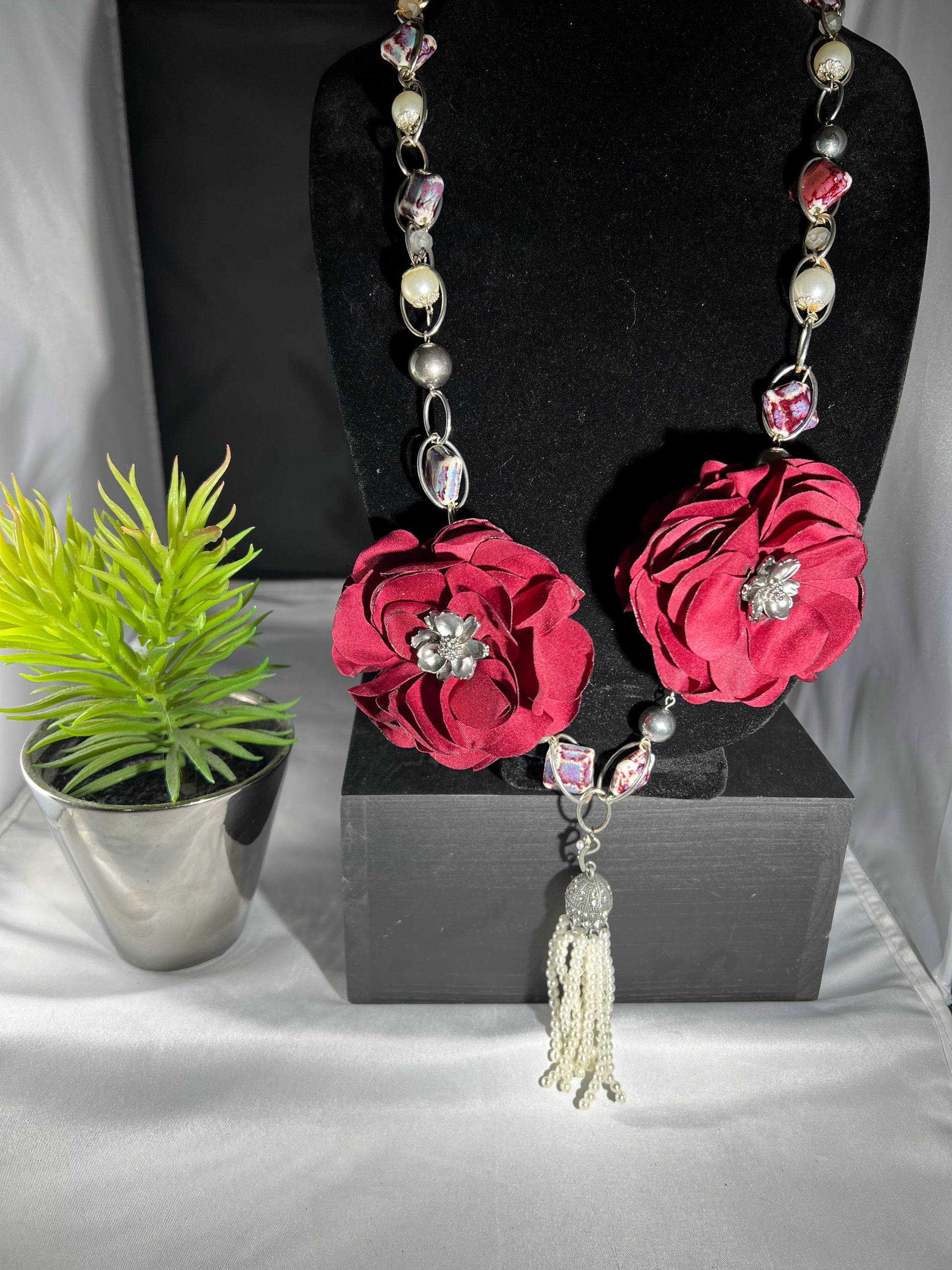 Dramatic and feminine, this statement necklace pairs oversized burgundy fabric roses with luminous pearls, metallic beads, and iridescent glass accents. The centerpiece is finished with a cascading faux pearl tassel, adding a sense of vintage glamour and movement. With a perfect balance of softness and shine, this piece is ideal for special occasions, artistic styling, or romantic flair.