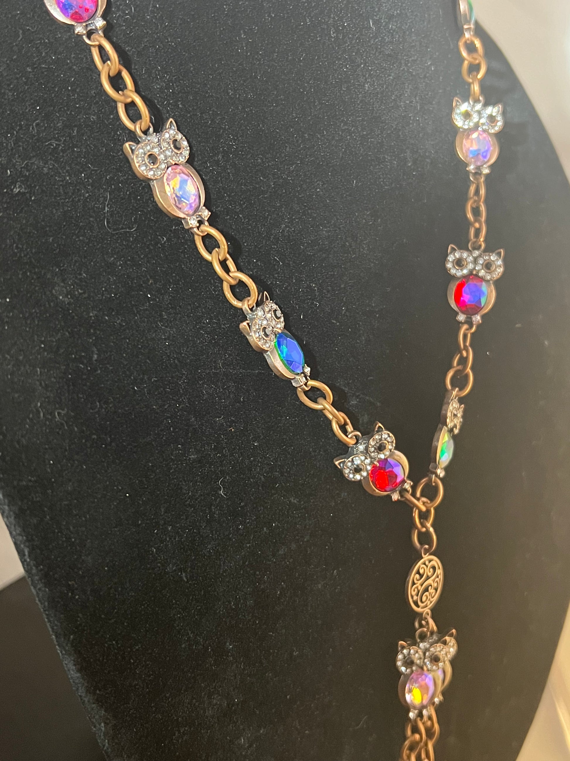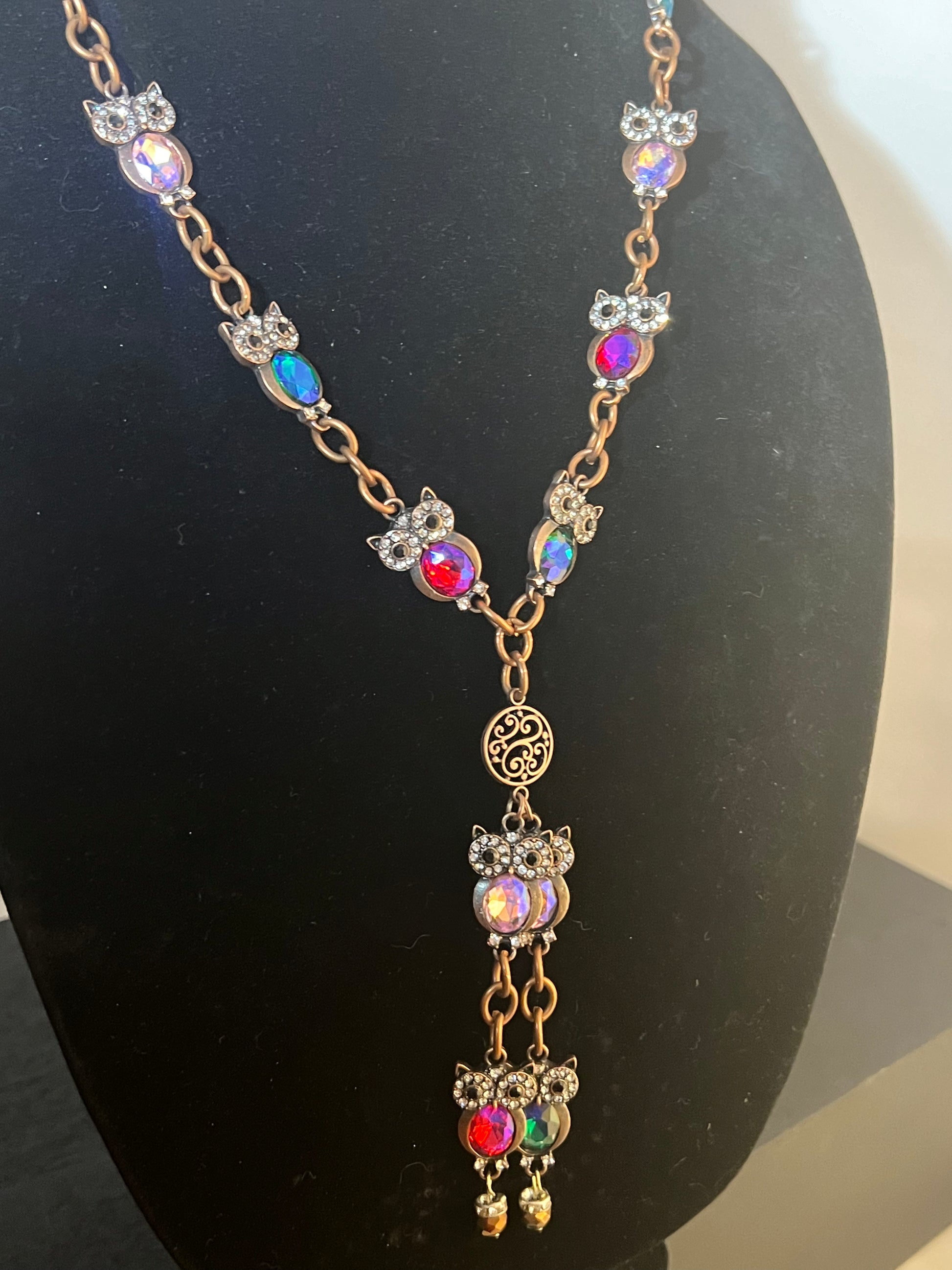 Bronze-tone chain with whimsical owl charms and multicolor crystals